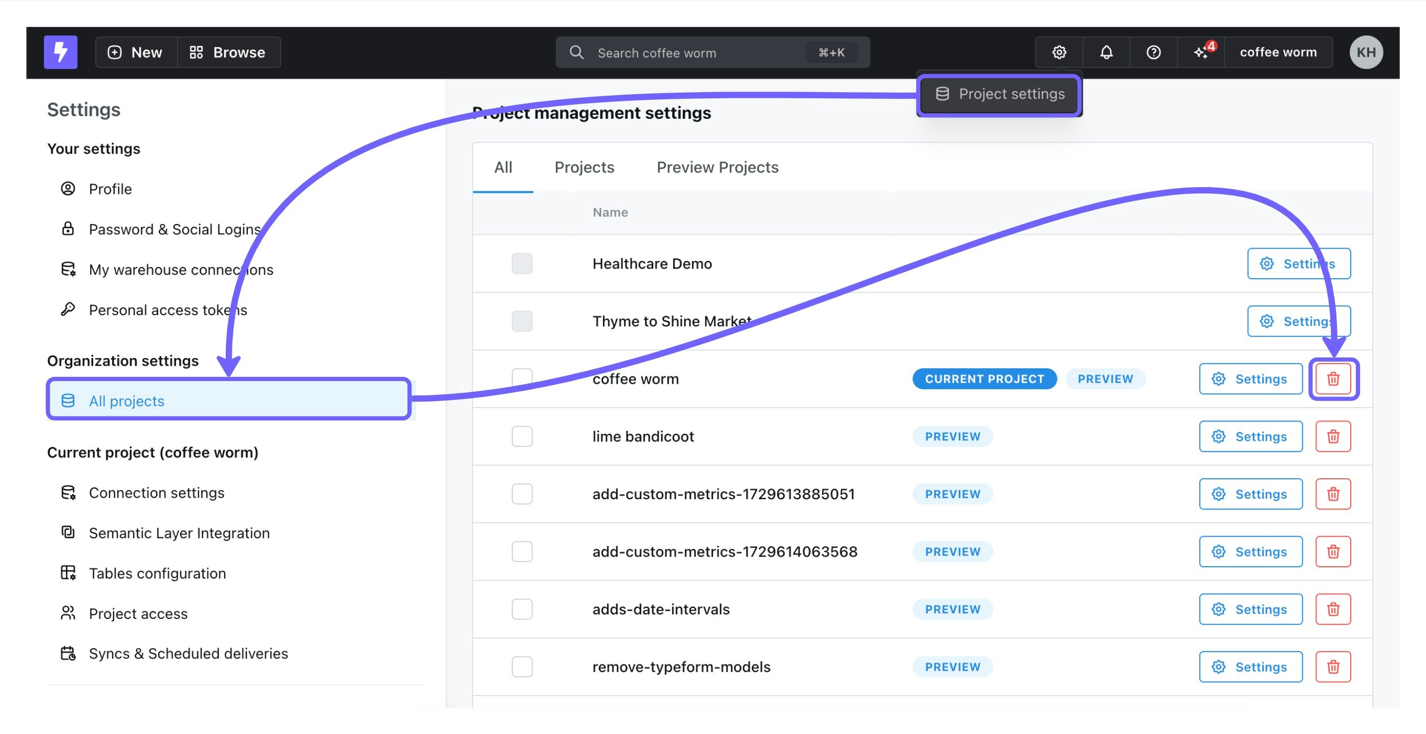 Preview projects created using any method can be deleted in the Lightdash App. There are also other more automated ways of deleting preview projects created in the Lightdash CLI and in GitHub Actions explained below.Lightdash CLI Tool (Local)