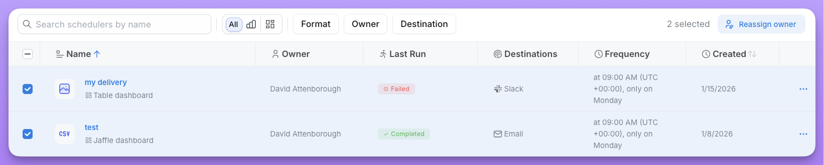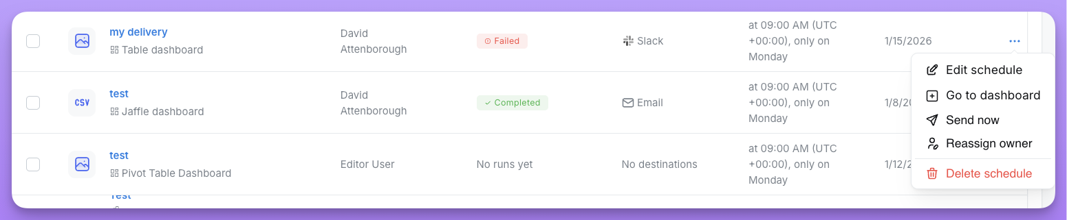 You can transfer ownership of scheduled deliveries to another user in your organization. This is useful when team members change roles or leave the organization.Reassigning a single delivery