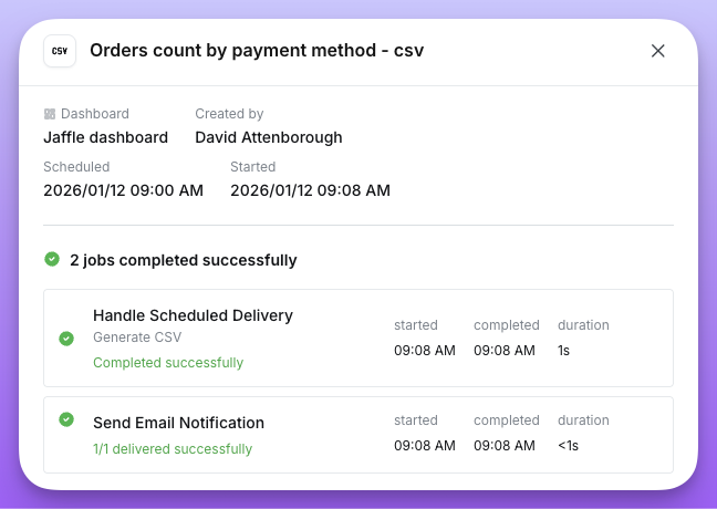 Each scheduled delivery displays a clear status indicator showing its current state:- Completed successfully - All jobs in the delivery completed without errors