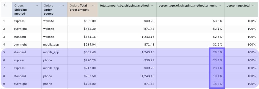 Since all calculations are performed before filtering, table calculation filters only hide rows without affecting the underlying calculations. For example: You use table calculations to calculate the percentage_of_shipping_method_amount, then filter to hide rows below 30%. The filtered rows (shown in purple) will disappear but the percentage_total calculation still shows 100% even though the visible percentages in the percentage_of_shipping_method_amount column no longer add up to 100%.