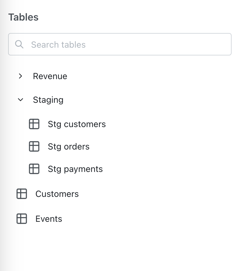Tables come from dbt models that have been defined in your dbt project’sschema.yml files.