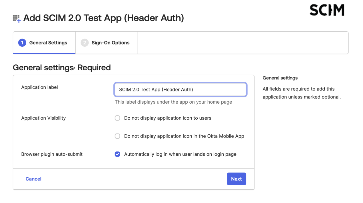- Search for “SCIM” and select SCIM 2.0 Test App (Header Auth).